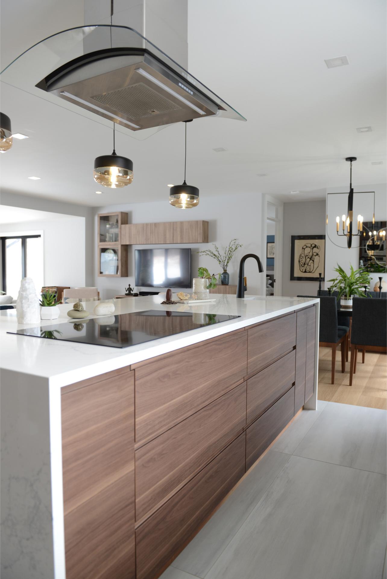 We completely gutted the entire core living space down to the studs, by first removing the 1976 Kitchen, living room and dining room areas and completely rebuilt the entire space from scratch. We took down the non-load bearing walls separating the living/dining room from the kitchen. We also removed the old wood-stove from the centre of the house and closed up the roof where it used to be.