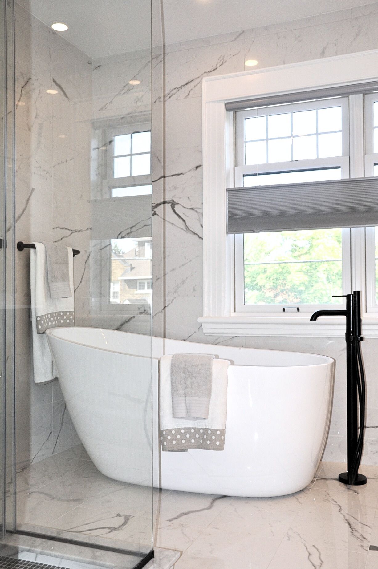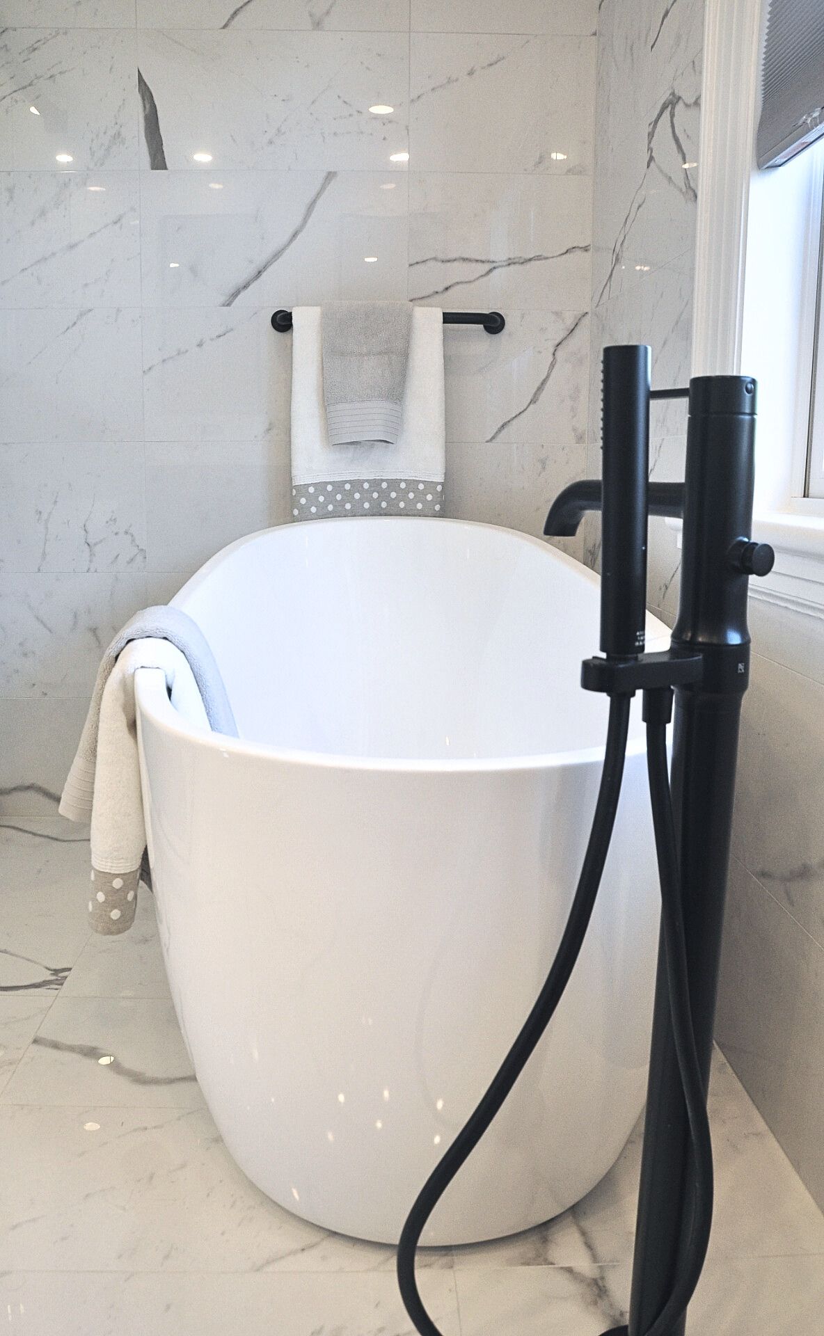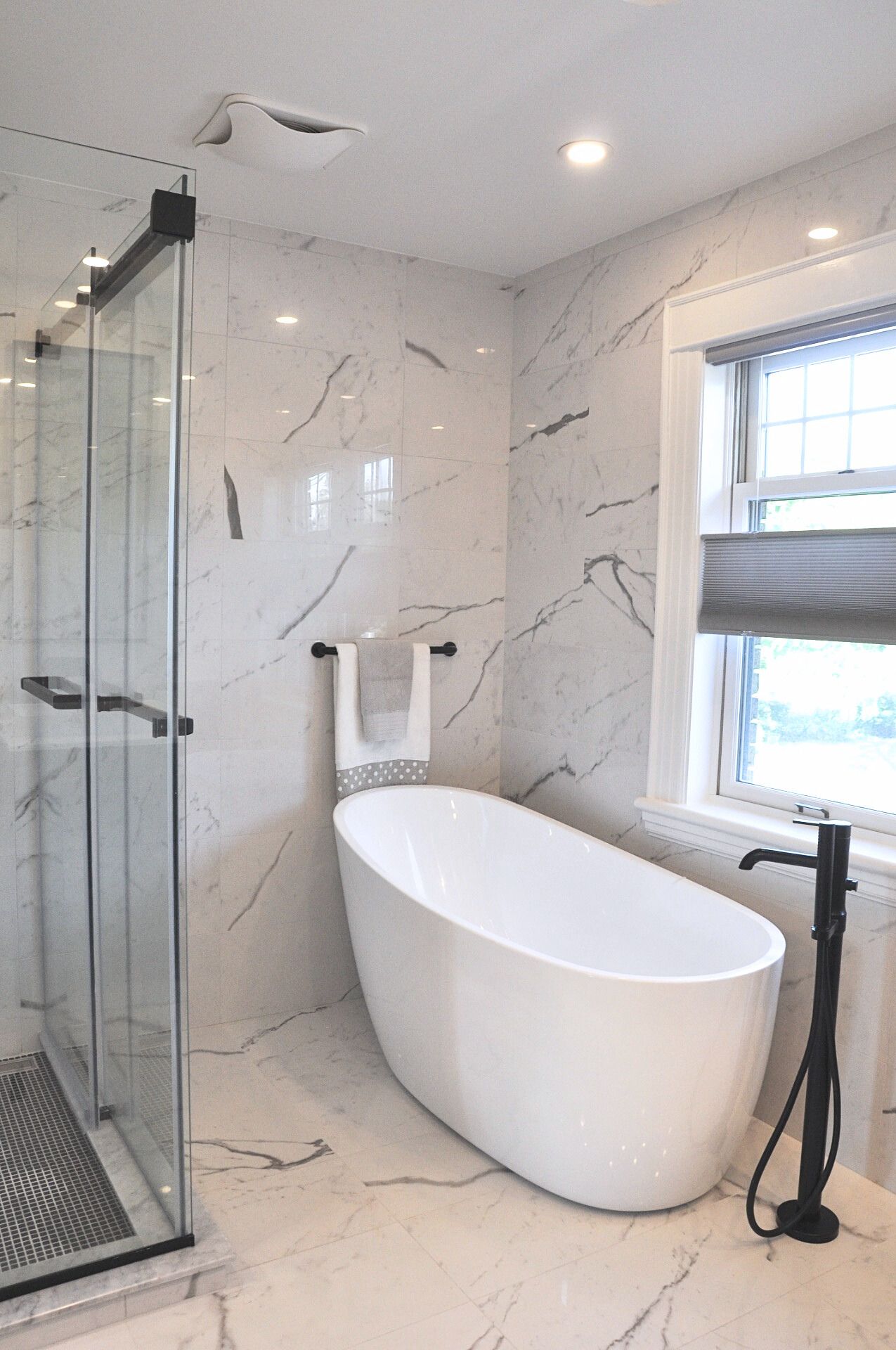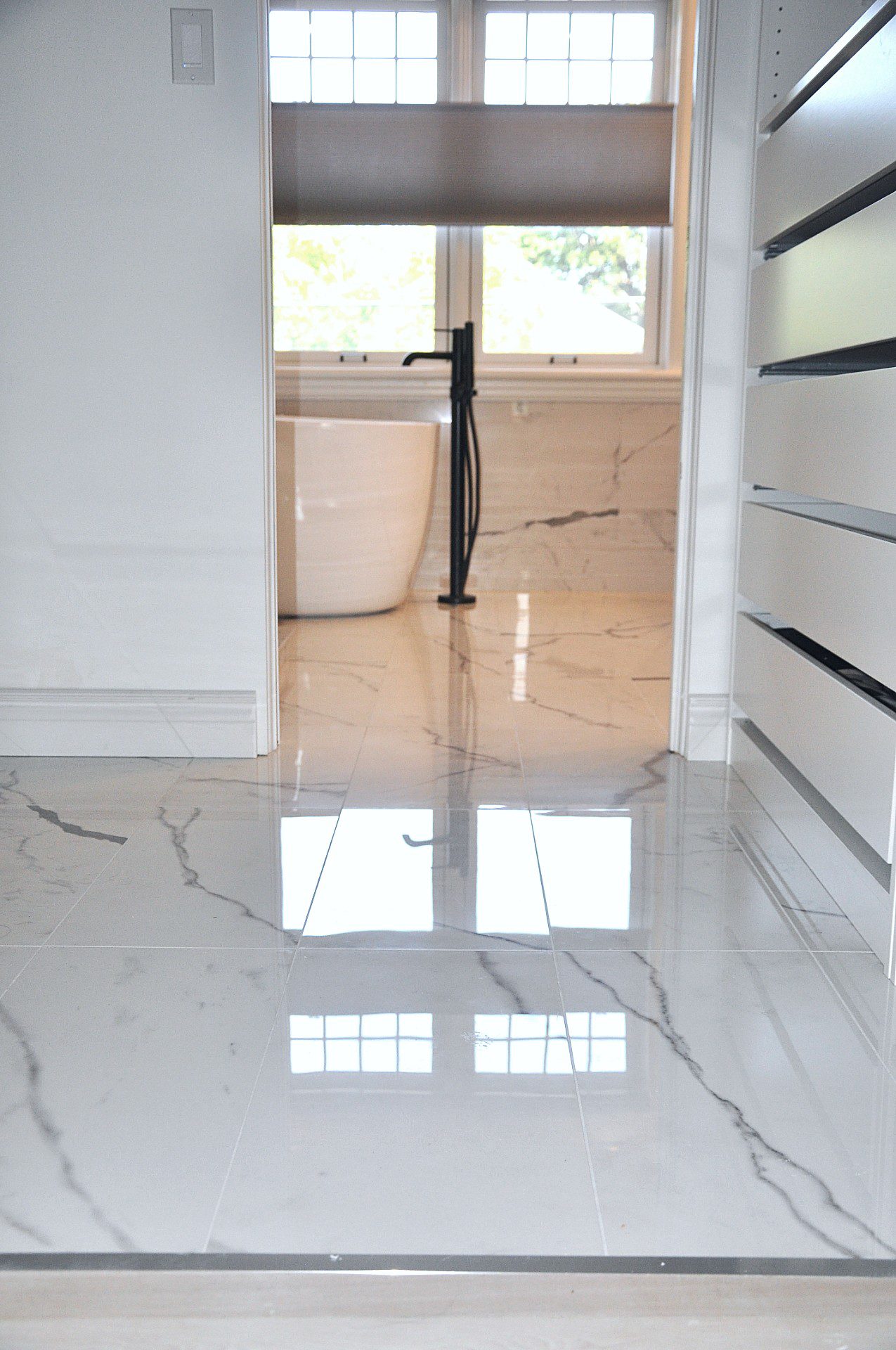 Wall mounted faucets over the vanity. Addition of free-standing tub. Floor to ceiling tile work.