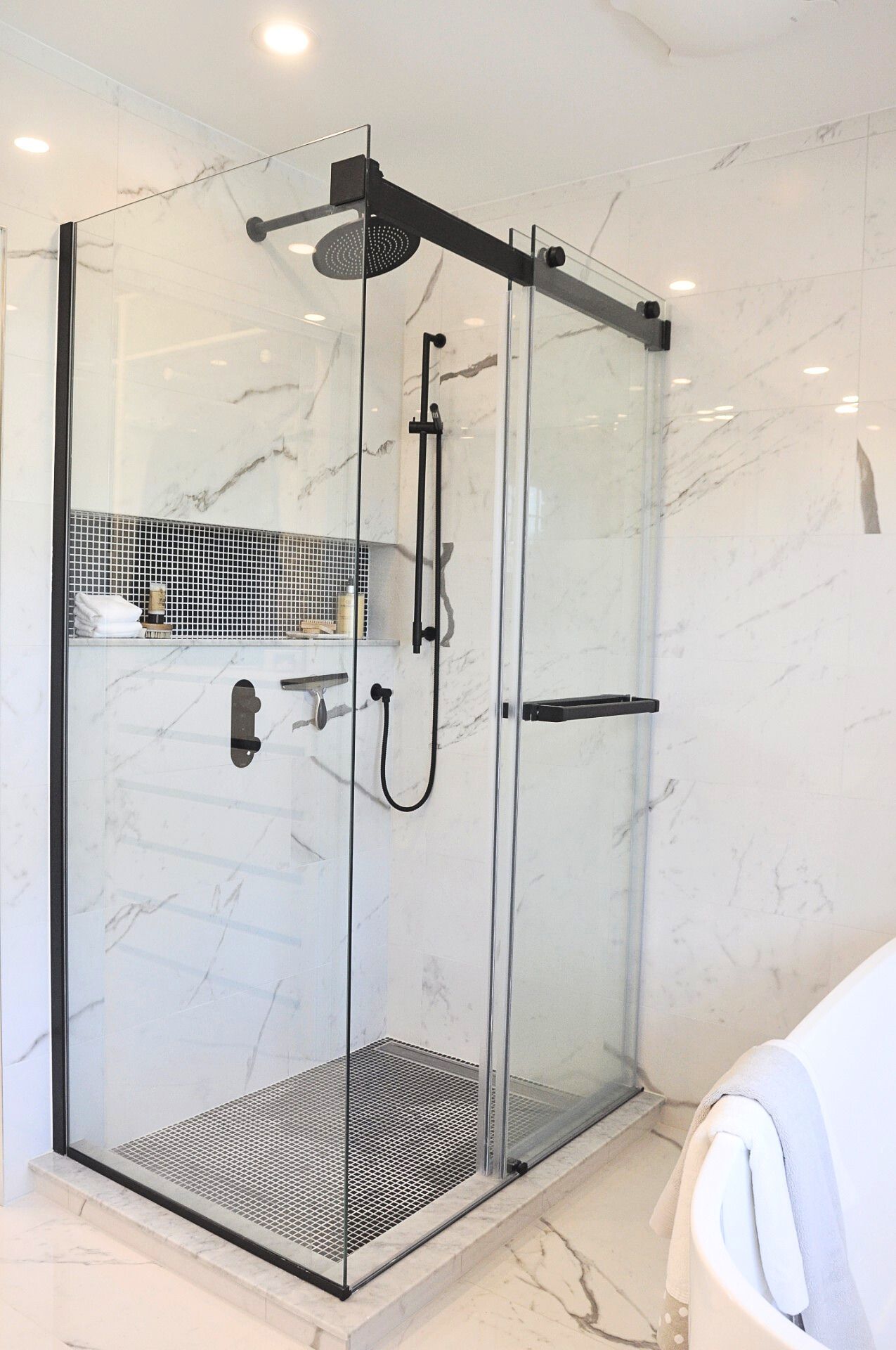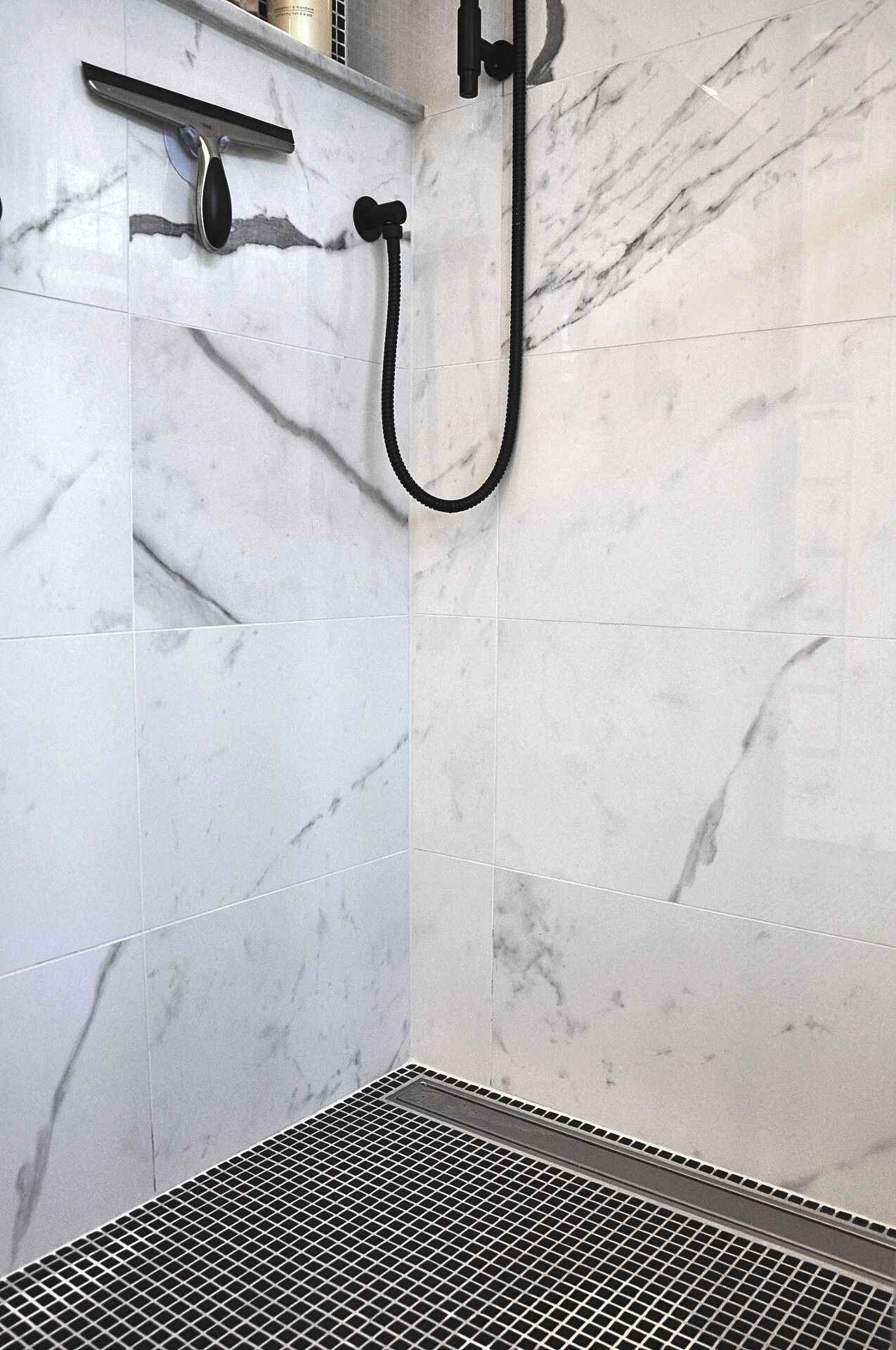 The floor and ceiling was levelled and we added our signature custom shower niche and linear drain to the shower.